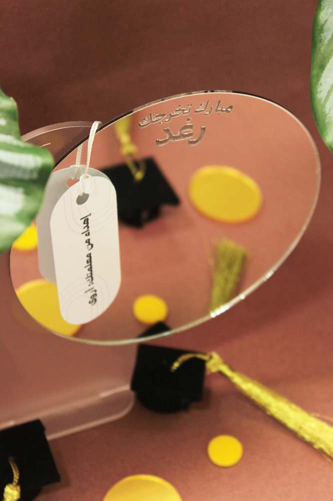 - مرآة محفور عليها عبارة ( مبارك تخرجك ) و يمكنك حفر الاسم والعبارة التي ترغب بها على المرآة